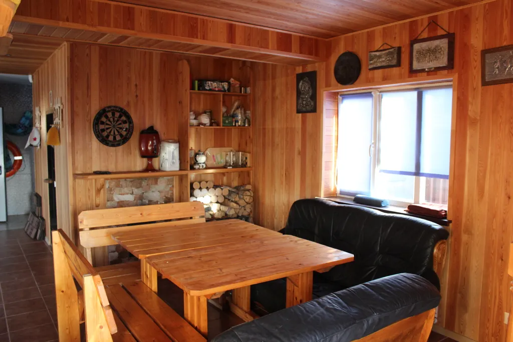 - 1 этаж: холл, гостиная с просторным раскладным диваном, камин, спутниковое ТВ, спальня с большой кроватью, кухня с выходом на улицу, душевая и туалет. Есть всё для комфортного проживания и отдыха (бытовая техника, кухонная утварь, средства уборки и химия).
