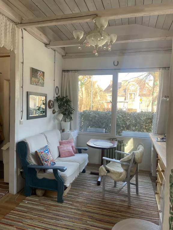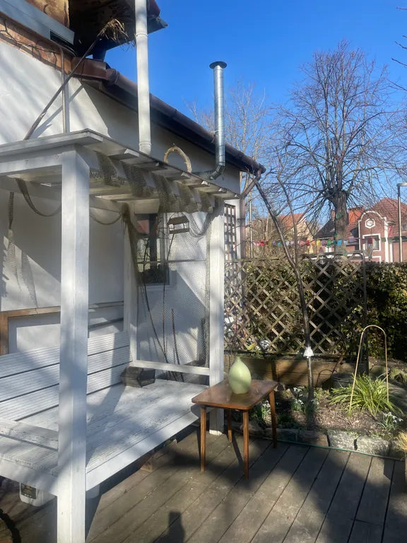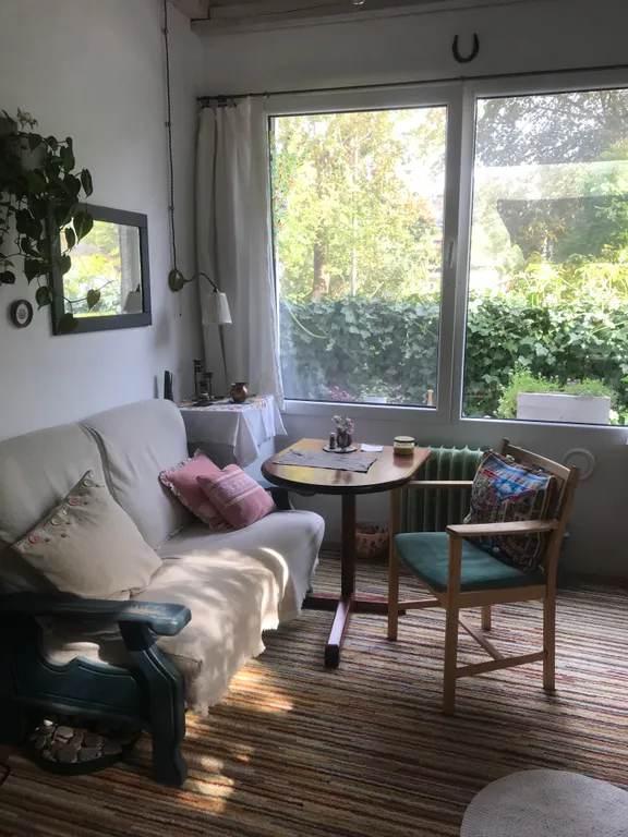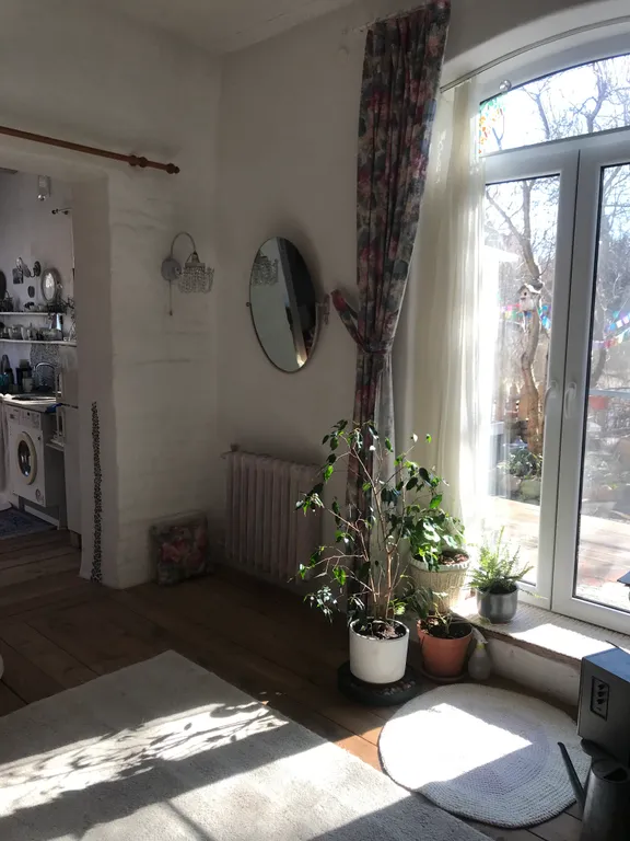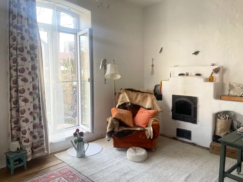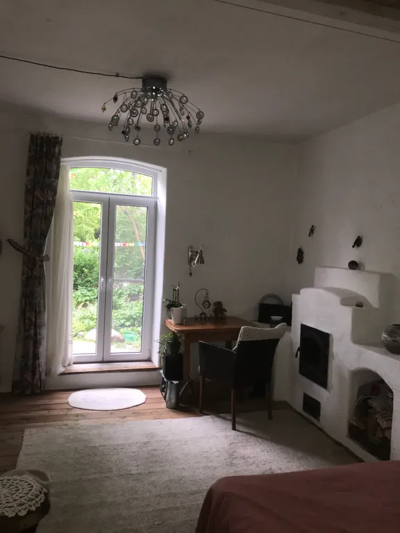 Это часть старинного прусского дома с отдельным входом и волшебным садом, где растут розы, гортензии, фиалки, груша, слива и даже персик). Есть небольшая беседка и деревянный настил — можно пить чай, работать или заниматься йогой по утрам.
