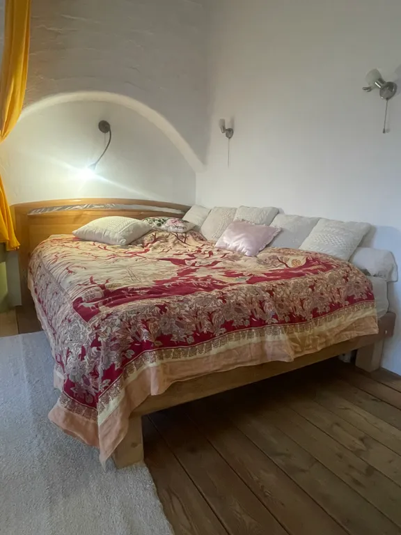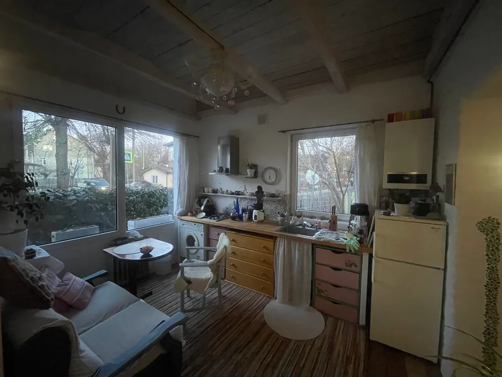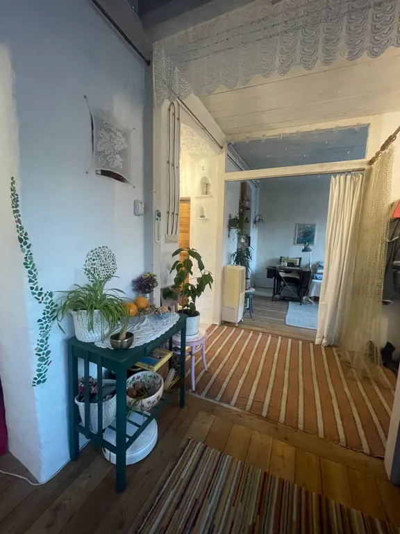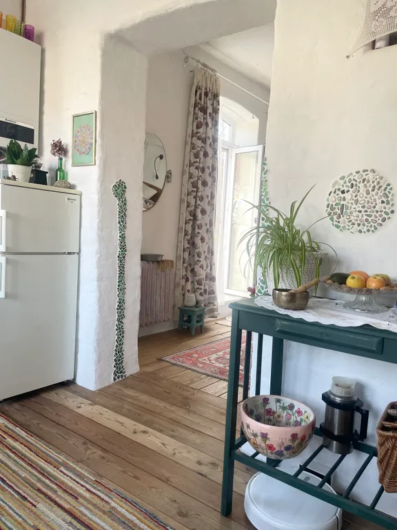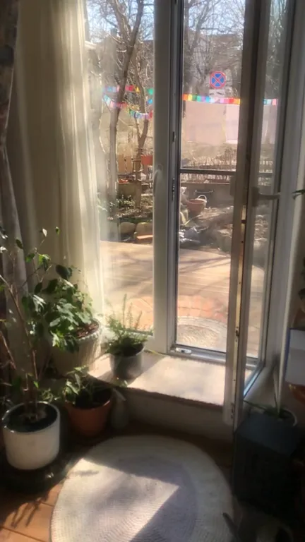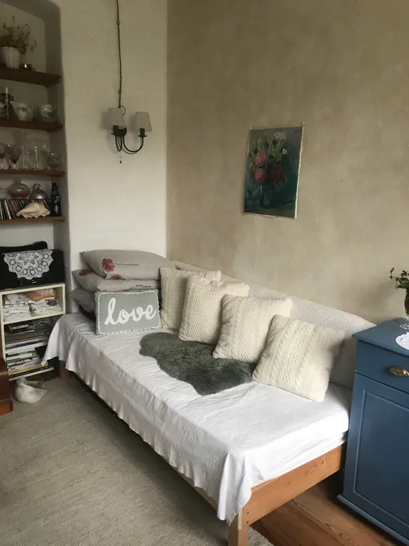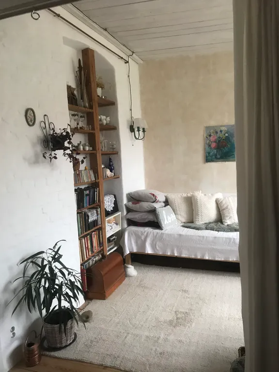 Это часть старинного прусского дома с отдельным входом и волшебным садом, где растут розы, гортензии, фиалки, груша, слива и даже персик). Есть небольшая беседка и деревянный настил — можно пить чай, работать или заниматься йогой по утрам.