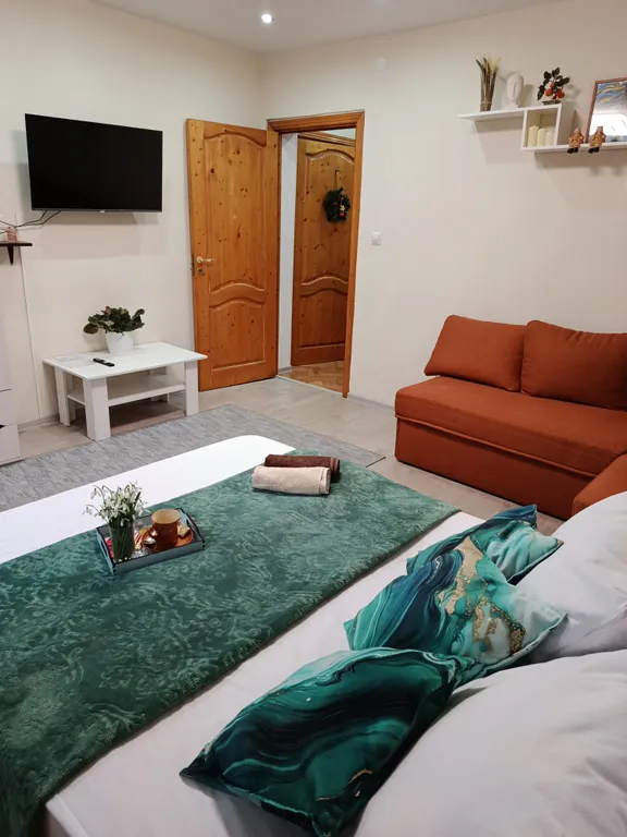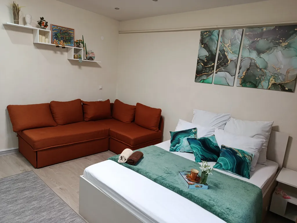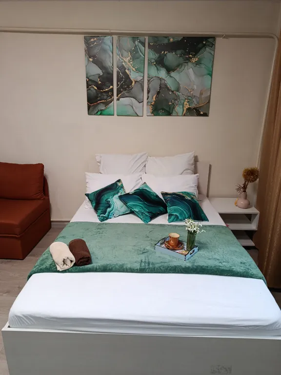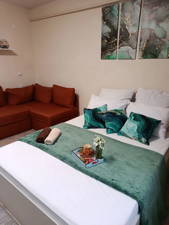 4 спальных места: двуспальная кровать 140*200 и раскладной диван 140*200.