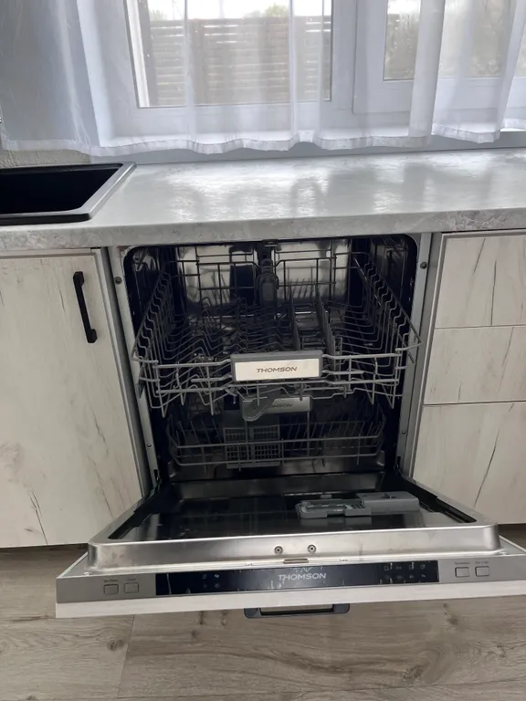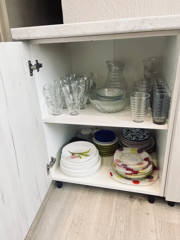 5) Холодильник, посудомоечная машина, газовая плита, электрический чайник, м/в печь, посуда и столовые приборы