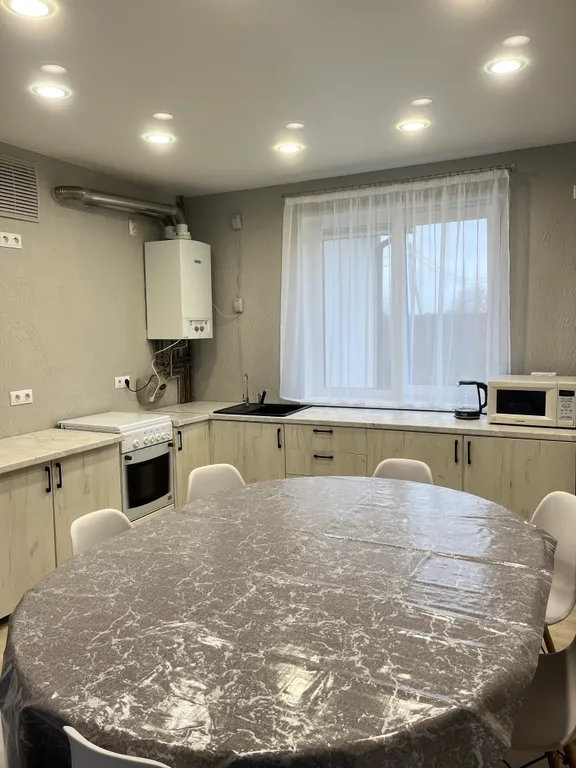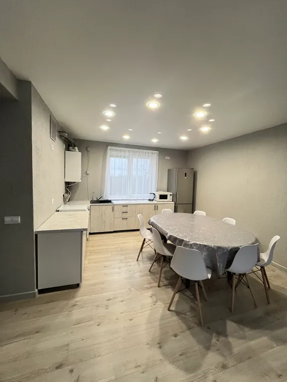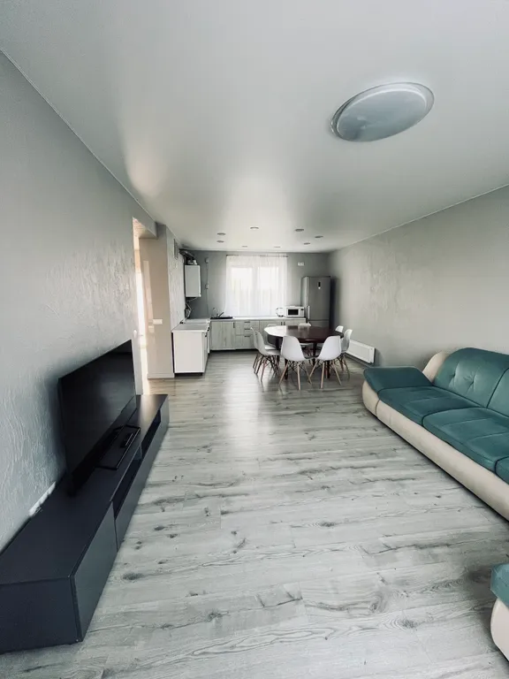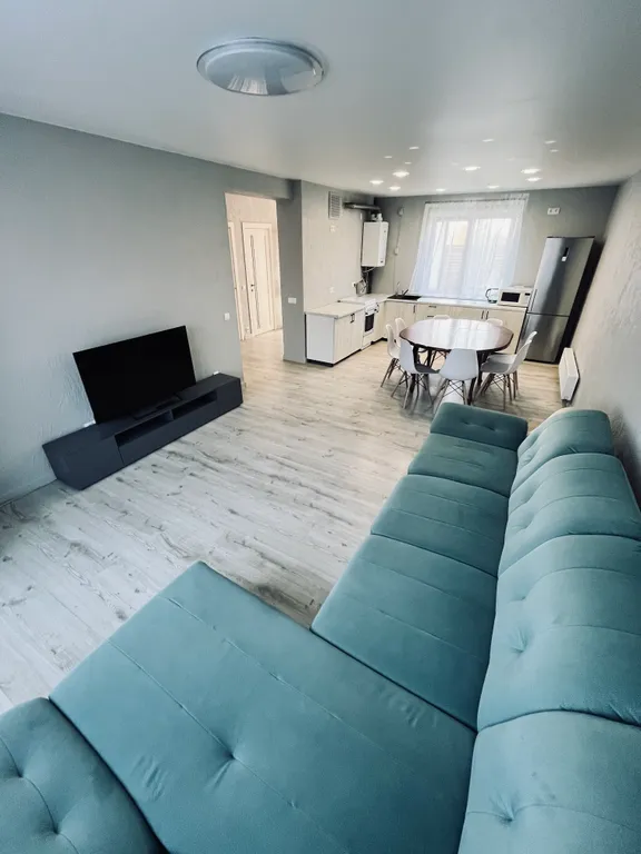 3) Кухня-гостиная 30 кв.м. с телевизором и выходом на задний двор