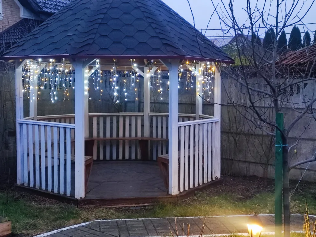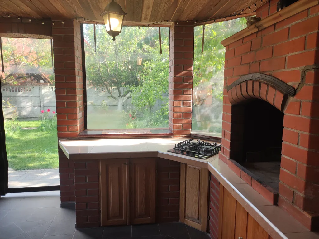 Автономное отопление, ландшафтная территория, открытая беседка, качели, банкетная крытая мансарда с печью-мангалом на 1 этаже, открытая мансарда с маркизой от солнца на 2 этаже, камин на дровах на 2 этаже.