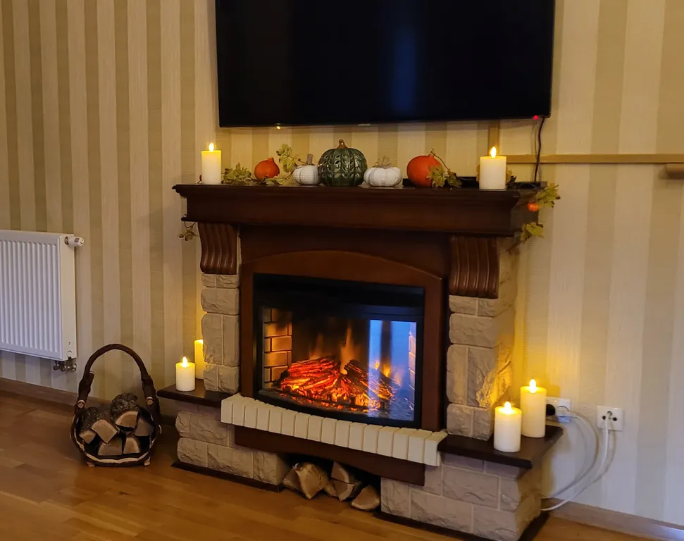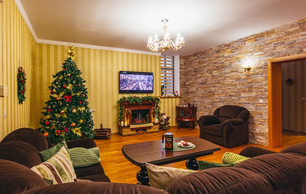 На первом этаже виллы размещены кухня-столовая, туалетная комната, большая терраса и просторная гостиная с камином, угловым диваном и большим телевизором.