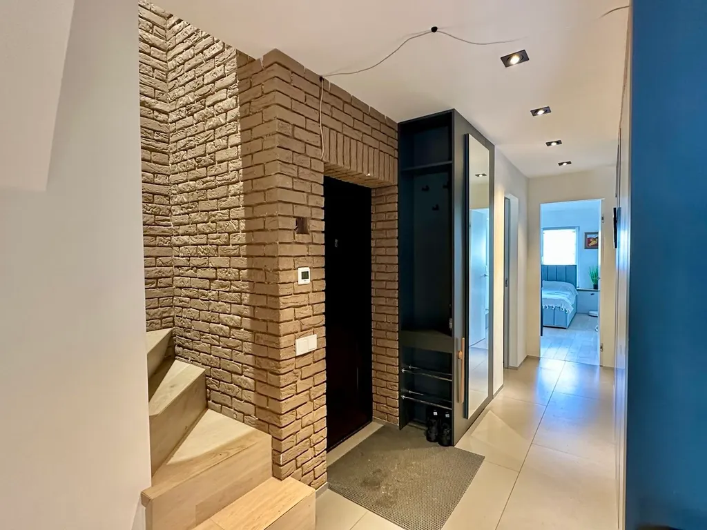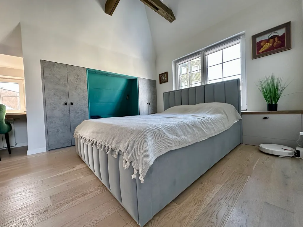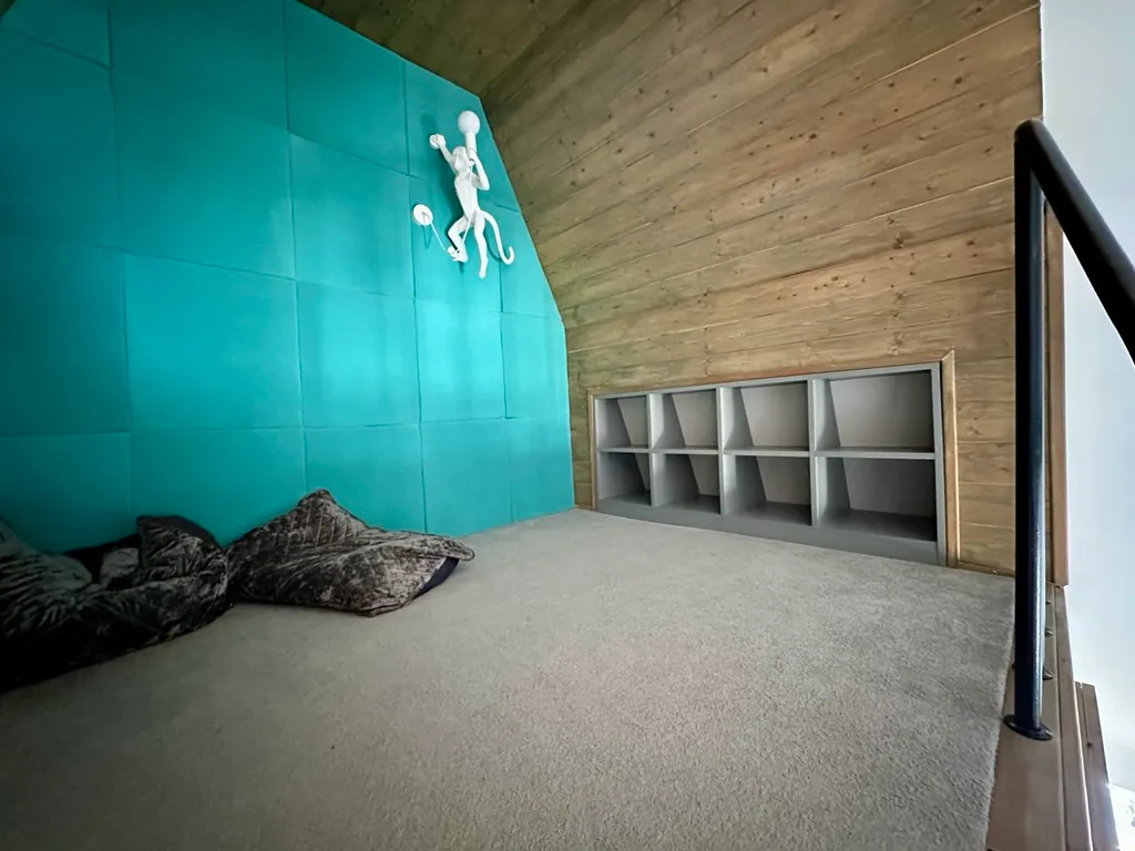Вторая спальная зона на втором этаже - большая двуспальная кровать, две рабочие зоны, жк телевизор, вместительный дизайнерский шкаф, второй туалет и душевая;