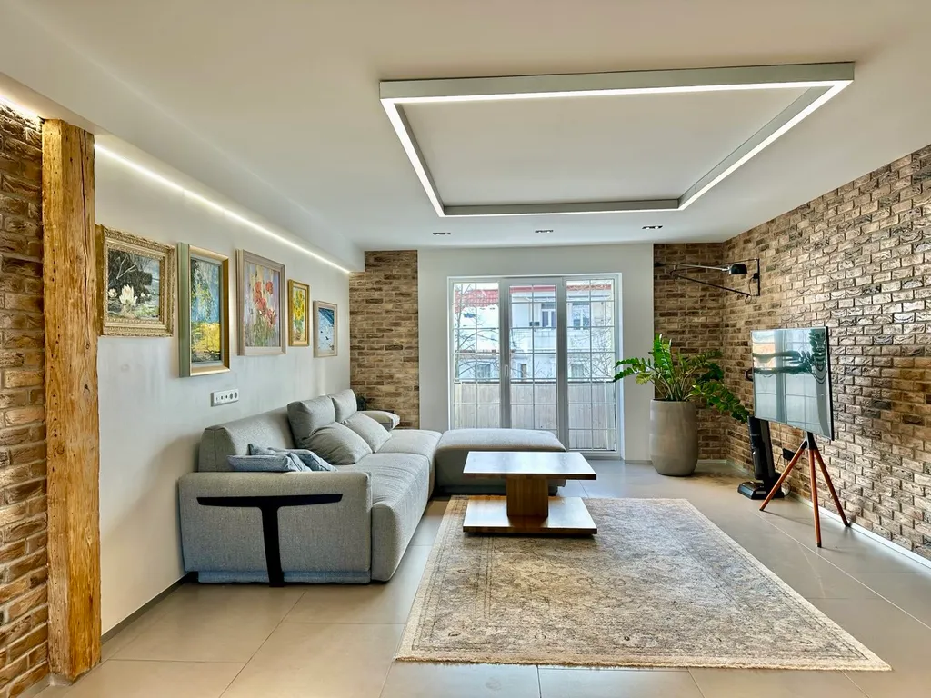 Гостиная зона - огромный диван, телевизор, журнальный столик, современные световые решения;