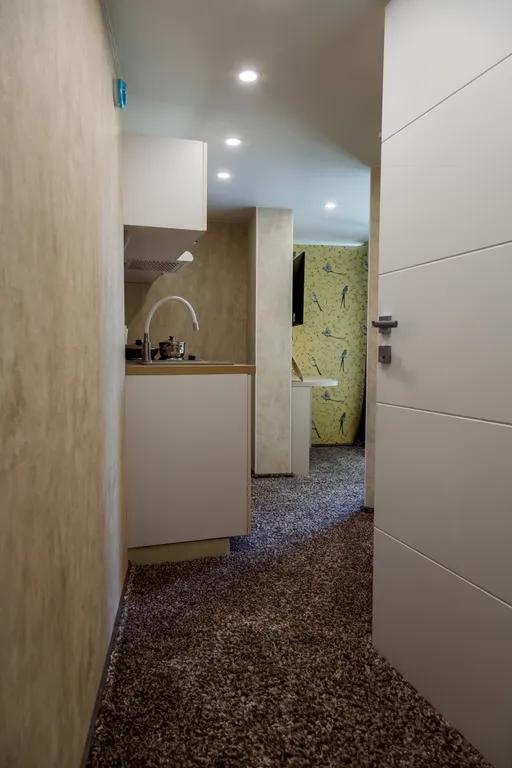 Для вашего удобства в апартаментах есть свой сан. узел и душевая. Кухонная зона включает в себя варочную поверхность, чайник, холодильник и необходимую посуду.