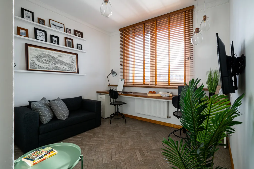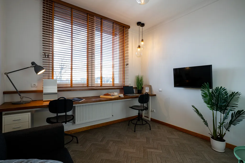 В квартире для удобного проживания имеется современная мебель и техника: одна большая двуспальная кровать (160*200см), бытовая техника, скоростной wi-fi и проводной интернет, большая рабочая зона, тв, стиральная машина, гладильная доска, утюг, сушка, оборудованная кухня, полный комплект посуды для приготовления и приёма еды, полотенца для лица и тела, шампунь/мыло (на 1 сутки проживания), тапочки.