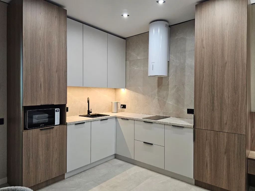 Кухня оборудована всей необходимой техникой: вместительный холодильник, чайник, индукционная плита, микроволновая печь. Имеется полный комплект посуды: тарелки, стаканы, бокалы, чашки, кастрюли, штопор и тд!