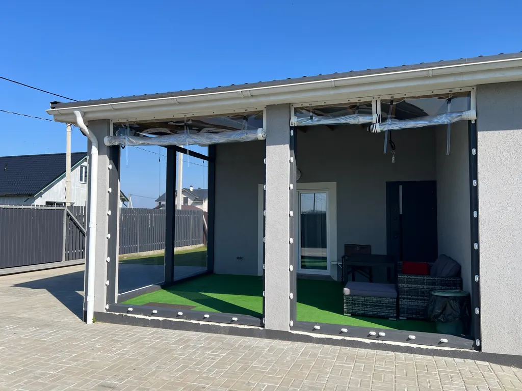 На территории дома есть закрытая терраса с зоной отдыха.