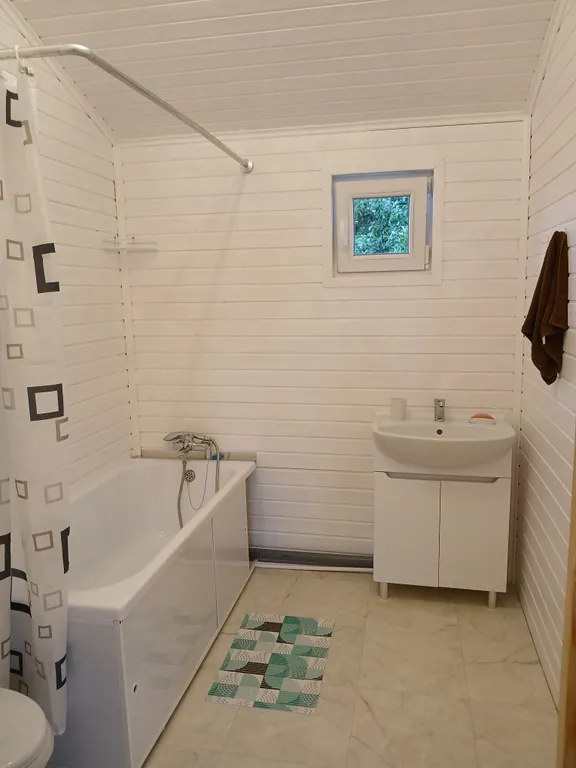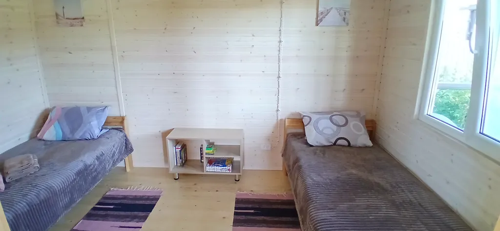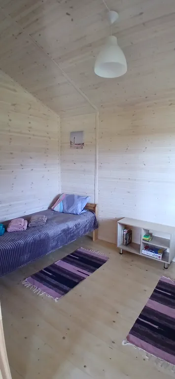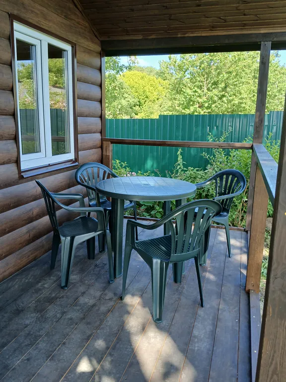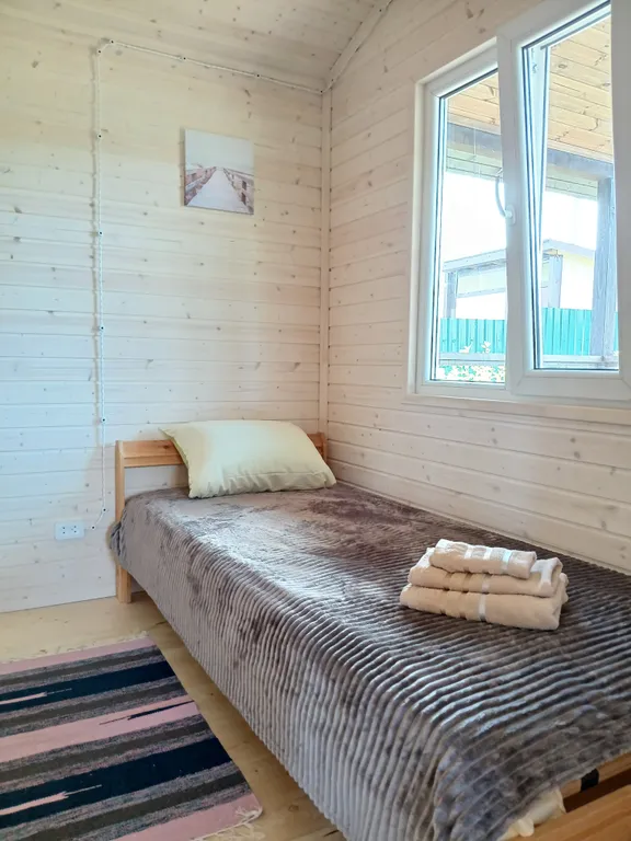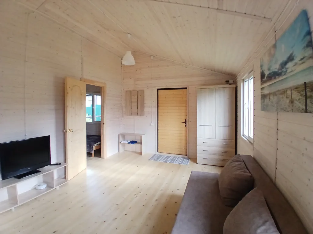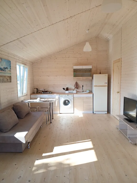 В домике есть кухня-гостиная с раскладным диваном, санузел с ванной и комната с двумя односпальными кроватями, которые при необходимости можно соединить в двуспальную, а также всё необходимое для вашего комфортного отдыха: холодильник, стиральная машина, телевизор, фен, утюг, постельное бельё и полотенца, микроволновая печь, электрическая плитка и вся необходимая посуда. На территории имеется мангал, веранда с садовой мебелью.