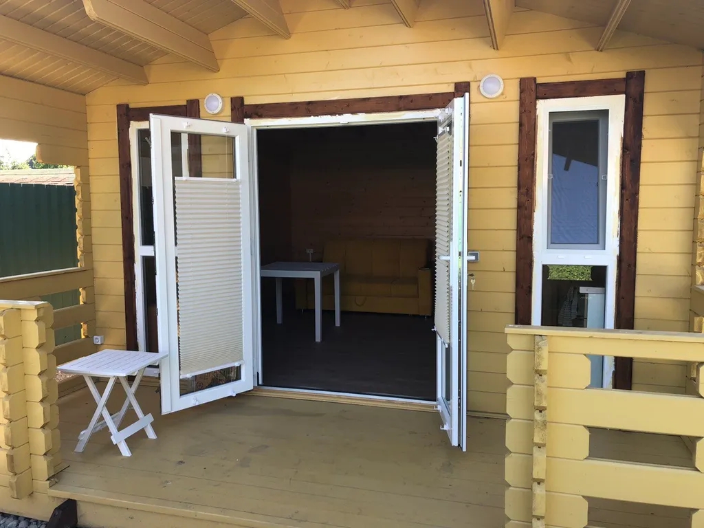 На территории находятся три таких одинаковых домика. В каждом уютном домике: двуспальный раскладной диван, кресло-кровать.