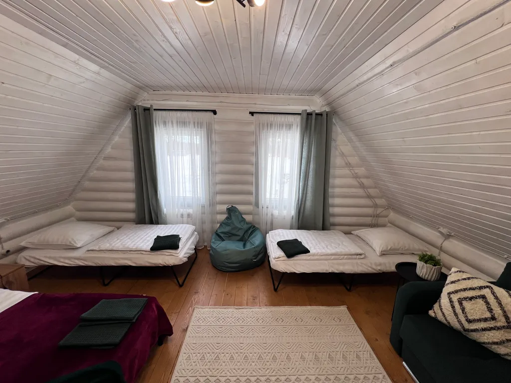 2 эт - малая спальня 2 сп кровать, Большая спальня - 2 сп кровать + раскладной диван на 2 чел + доп ставим 2 раскладные кровати