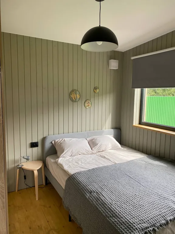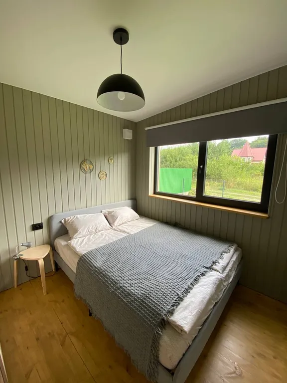 В новом уютном домике есть спальня с большой кроватью 160 см и гостиная с раскладным диваном.
