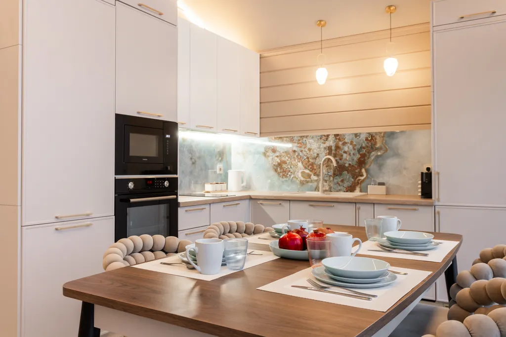 Полностью оборудованная кухня: духовка, кофемашина, индукционная плита, СВЧ, посудомоечная машина, холодильник, морозильник.