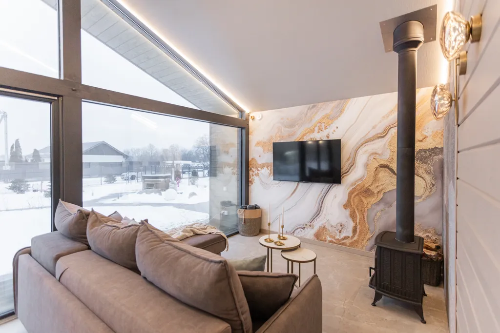 Горячая купель под открытым небом, панорамное остекление, природный сад, утопающий в цветах, костровая зона, солярий с шезлонгами и просторная терраса — всё только для вас.