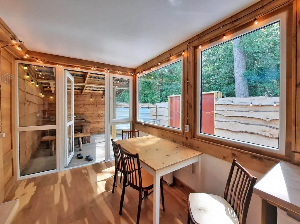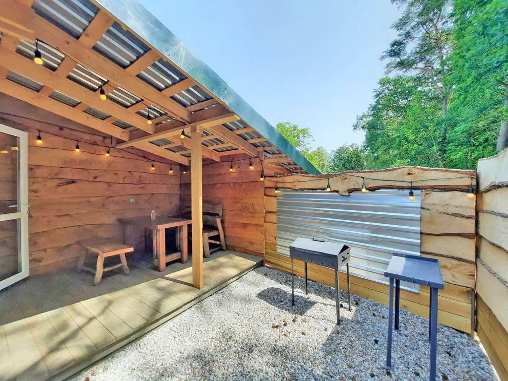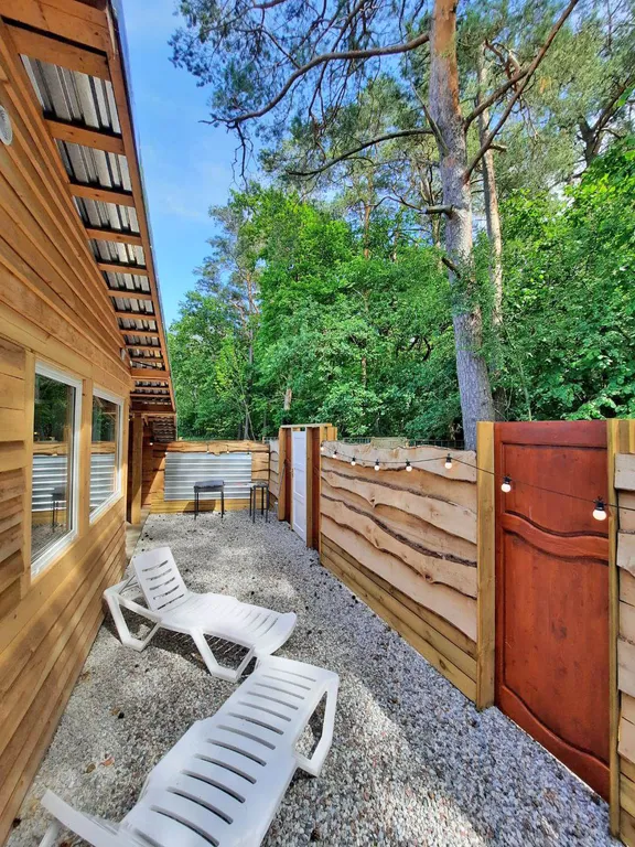 Территория — личная, только ваша. Отдельный вход. Огорожена от посторонних взглядов. Терраса с навесом и мебелью. Шезлонги. Мангал. Освещение. Вид на лес. Без соседей.