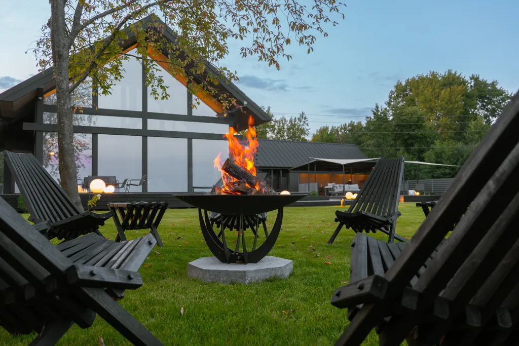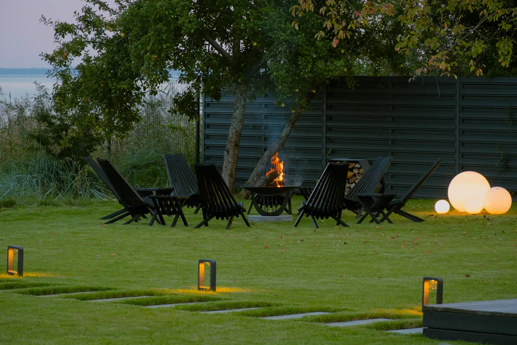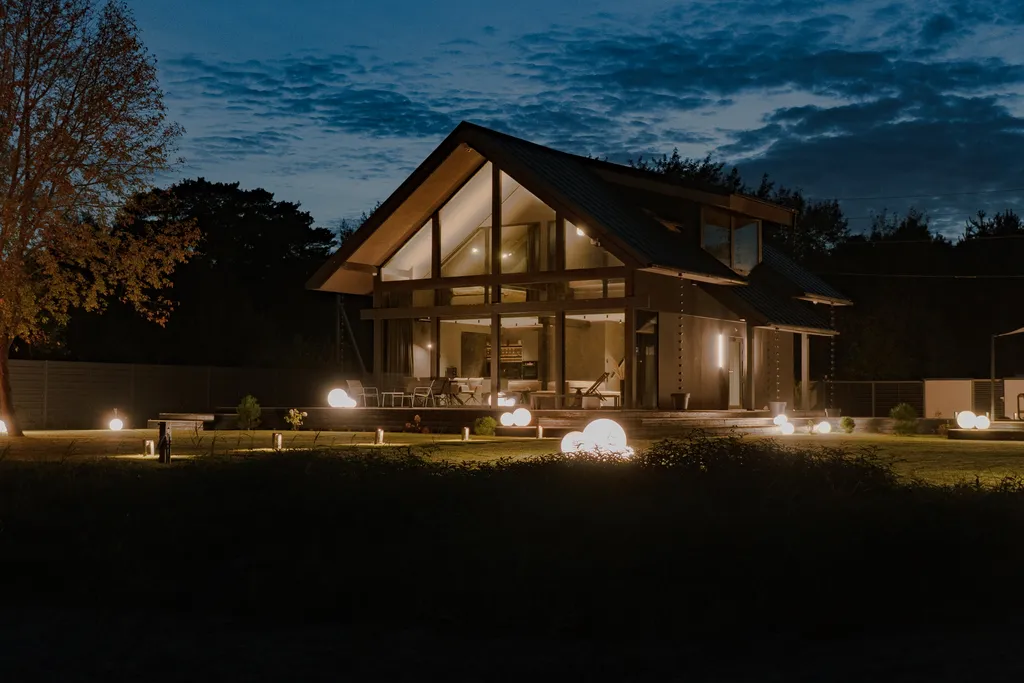 С наступлением вечера пространство раскрывается по-новому: дизайнерская подсветка сада с мягкими светящимися «жемчужинами» создаёт атмосферу уюта и лёгкой магии, превращая территорию в приватный курорт.