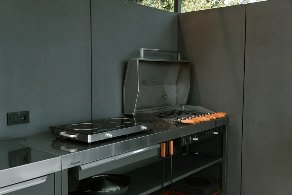 - Уличная кухня с мангалом, грилем weber и зоной для ужинов