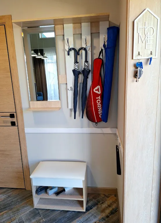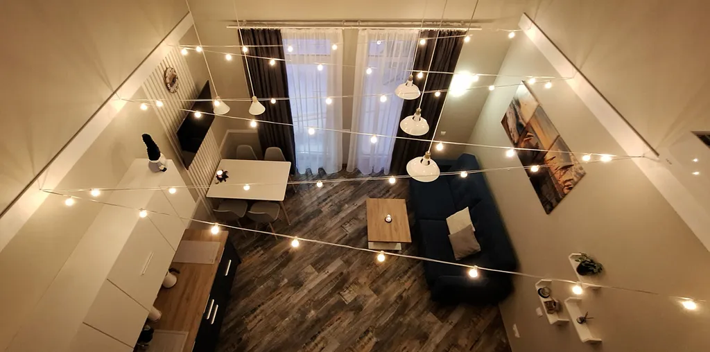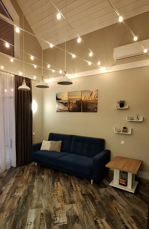 Дом имеет оригинальную планировку со вторым светом. На 1 этаже располагается светлая кухня-столовая и гостиная с раскладным диваном, отдельная спальня с двуспальной кроватью и ванная комната с душем. Вторая спальня с двуспальной кроватью находится на атмосферной мансарде, куда ведёт удобная лестница.