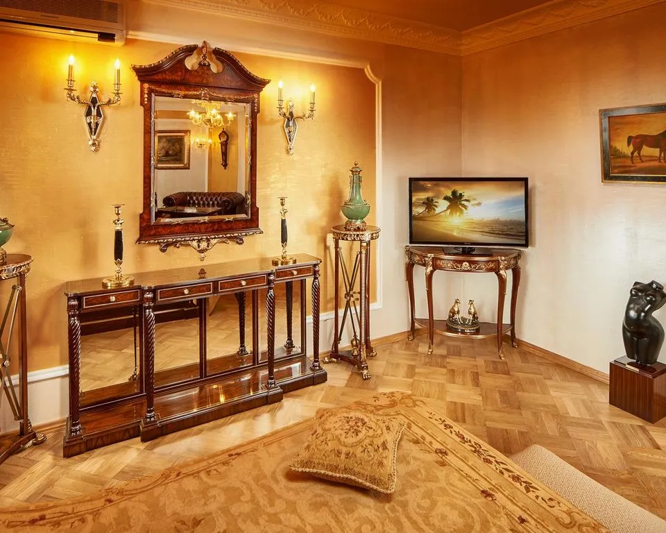 Блеск и отчаянное желание наслаждаться жизнью, интерьеры в духе фильма "Великий Гэтсби" изысканность и общее ощущение праздника - все это Art Deco. Отделка и меблировка некоторых апартаментов, превышает 10 000 000 руб. В 2021 произведен ремонт и заменена мебель. Все апартаменты выдержаны в индивидуальном классическом стиле с использованием благородных пород дерева (дуб, красное дерево, карельская береза,) мрамора и гранита. В оформлении апартаментов использована мебель и аксессуары, в стиле Art Deco,- Maitland Smith,Theodore Alexander, также здесь представлена коллекция антикварной мебели и аксессуаров, которые предают нотки средневекового романтизма. Убранство апартаментов дополняется роскошными люстрами, торшерами и бра фирмы Swarovski, которые сочетаются с гипсовой лепниной и высотой потолка достигающей четырех метров. Межкомнатные двери изготовлены из ясеня , полы паркет, из дуба и красного дерева. Матрасы с эффектом памяти, в качестве наполнителя отличаются повышенным уровнем комфорта. Все помещения в апартаментах, оборудованы телевизорами с плоским экраном и спутниковыми каналами. В ванных комнатах установлена элитная английская и итальянская сантехника Ceramica Ala(Modellazione), Kehler, Keramag. Лаунж -зона оформлена в старинном стиле с действующим камином, потолком из мореного дуба, гранитным полом и стенами толщиною в метр. Вилла расположен в вблизи старого парка имени Теодора Кроне , недалеко от питьевых озер - памятника цивилизации времен тевтонских рыцарей, сооруженных орденом в 13 веке.